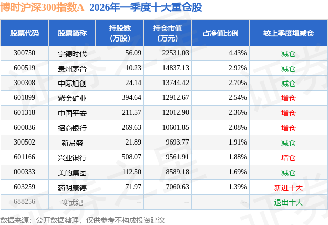 从基金规模来看,博时沪深300指数A基金2026年一季度公布的基金规模为43.41亿元,较上一期规模49.58亿元变化了-6.17亿元,环比变化了-12.44%。该基金最新一期资产配置为:股票占净值比93.79%,无债券类资产,现金占净值比6.18%。从基金持仓来看,该基金当季前十大股票仓位达23.9%,第一大重仓股为宁德时代(300750),持仓占比为4.43%。