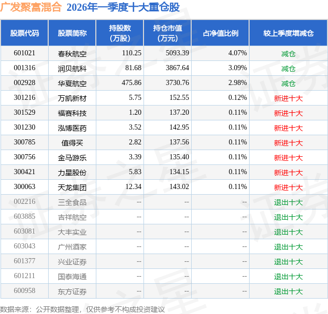 从基金规模来看,广发聚富混合基金2026年一季度公布的基金规模为12.5亿元,较上一期规模14.24亿元变化了-1.74亿元,环比变化了-12.19%。该基金最新一期资产配置为:股票占净值比20.43%,债券占净值比75.0%,现金占净值比17.53%。从基金持仓来看,该基金当季前十大股票仓位达10.92%,第一大重仓股为春秋航空(601021),持仓占比为4.07%。