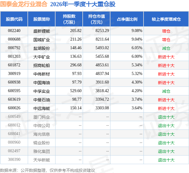 从基金规模来看,国泰金龙行业混合基金2026年一季度公布的基金规模为9.09亿元,较上一期规模8.5亿元变化了5886.8万元,环比变化了6.93%。该基金最新一期资产配置为:股票占净值比81.75%,债券占净值比28.71%,现金占净值比1.53%。从基金持仓来看,该基金当季前十大股票仓位达56.71%,第一大重仓股为盛新锂能(002240),持仓占比为9.08%。
