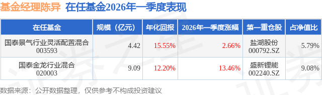 证券之星消息,日前国泰金龙行业混合基金公布一季报,2026年一季度最新规模9.09亿元,季度净值涨幅为13.46%。