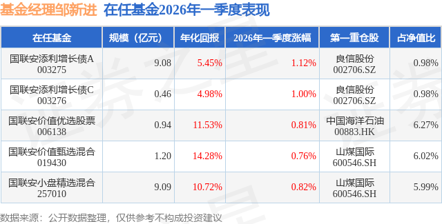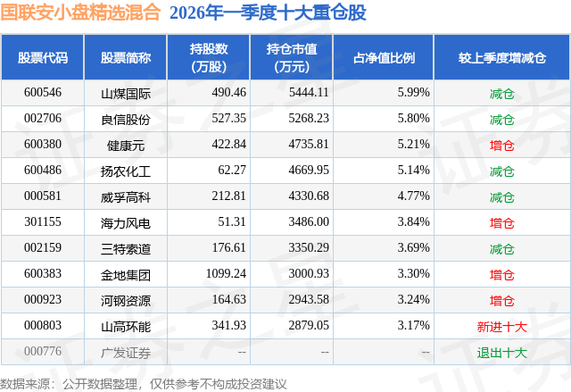 从基金规模来看,国联安小盘精选混合基金2026年一季度公布的基金规模为9.09亿元,较上一期规模8.37亿元变化了7227.78万元,环比变化了8.64%。该基金最新一期资产配置为:股票占净值比74.02%,债券占净值比22.73%,现金占净值比2.96%。从基金持仓来看,该基金当季前十大股票仓位达44.15%,第一大重仓股为山煤国际(600546),持仓占比为5.99%。