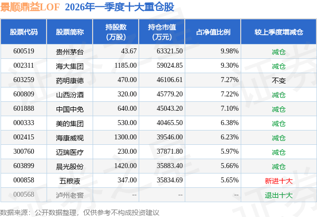 从基金规模来看,景顺鼎益LOF基金2026年一季度公布的基金规模为63.21亿元,较上一期规模100.14亿元变化了-36.92亿元,环比变化了-36.87%。该基金最新一期资产配置为:股票占净值比92.91%,债券占净值比3.99%,现金占净值比3.29%。从基金持仓来看,该基金当季前十大股票仓位达70.76%,第一大重仓股为贵州茅台(600519),持仓占比为9.98%。