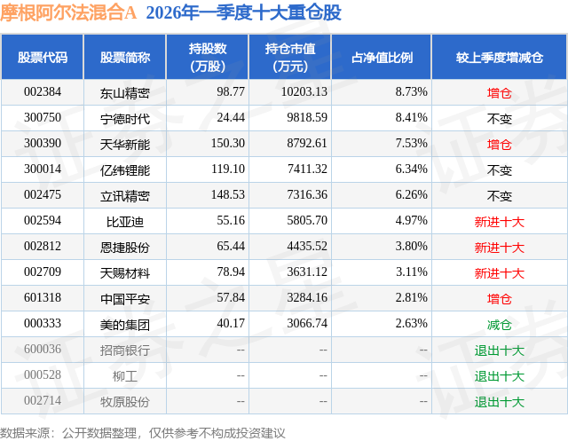 证券之星消息,日前摩根阿尔法混合A基金公布一季报,2026年一季度最新规模11.56亿元,季度净值涨幅为0.37%。