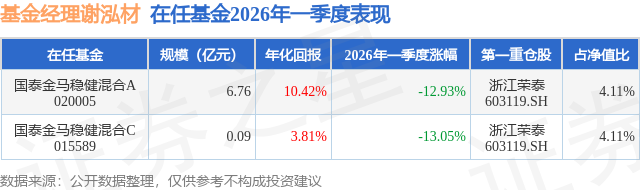 证券之星消息,日前国泰金马稳健混合A基金公布一季报,2026年一季度最新规模6.76亿元,季度净值涨幅为-12.93%。
