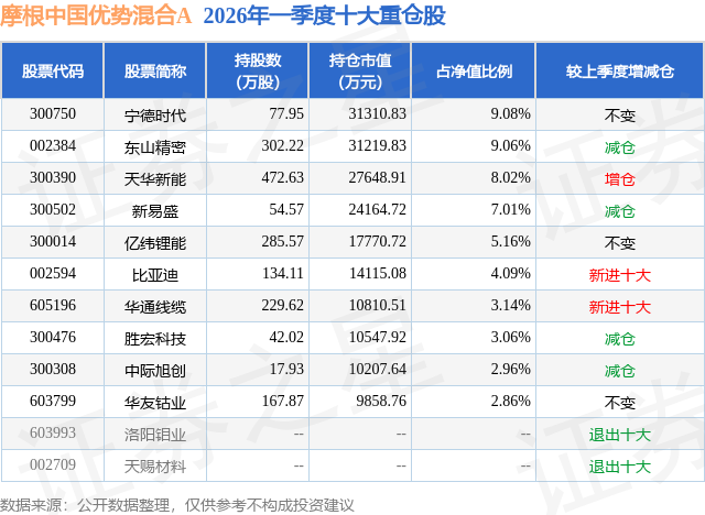 从基金规模来看,摩根中国优势混合A基金2026年一季度公布的基金规模为30.68亿元,较上一期规模15.75亿元变化了14.93亿元,环比变化了94.75%。该基金最新一期资产配置为:股票占净值比93.54%,无债券类资产,现金占净值比7.42%。从基金持仓来看,该基金当季前十大股票仓位达54.44%,第一大重仓股为宁德时代(300750),持仓占比为9.08%。