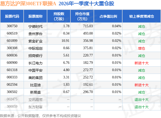 从基金规模来看,易方达沪深300ETF联接A基金2026年一季度公布的基金规模为129.57亿元,较上一期规模135.72亿元变化了-6.15亿元,环比变化了-4.53%。该基金最新一期资产配置为:股票占净值比0.68%,债券占净值比2.51%,现金占净值比4.2%。从基金持仓来看,该基金当季前十大股票仓位达0.16%,第一大重仓股为宁德时代(300750),持仓占比为0.04%。