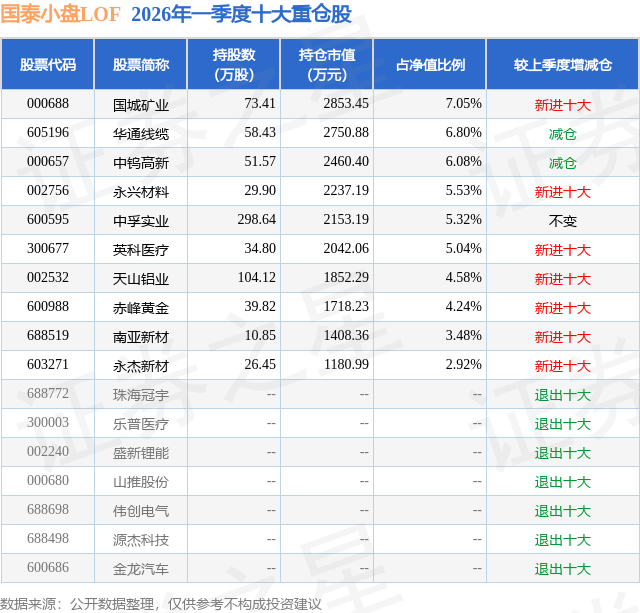 从基金规模来看,国泰小盘LOF基金2026年一季度公布的基金规模为4.05亿元,较上一期规模4.37亿元变化了-3248.15万元,环比变化了-7.43%。该基金最新一期资产配置为:股票占净值比71.23%,债券占净值比6.05%,现金占净值比16.67%。从基金持仓来看,该基金当季前十大股票仓位达51.04%,第一大重仓股为国城矿业(000688),持仓占比为7.05%。
