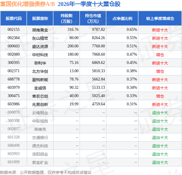从基金规模来看,富国优化增强债券A/B基金2026年一季度公布的基金规模为38.79亿元,较上一期规模1.35亿元变化了37.44亿元,环比变化了2764.68%。该基金最新一期资产配置为:股票占净值比16.79%,债券占净值比90.64%,现金占净值比3.14%。从基金持仓来看,该基金当季前十大股票仓位达4.36%,第一大重仓股为湖南黄金(002155),持仓占比为0.65%。