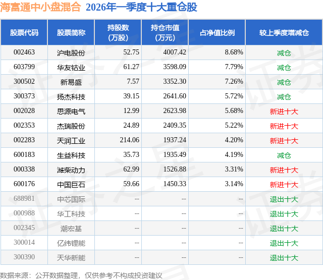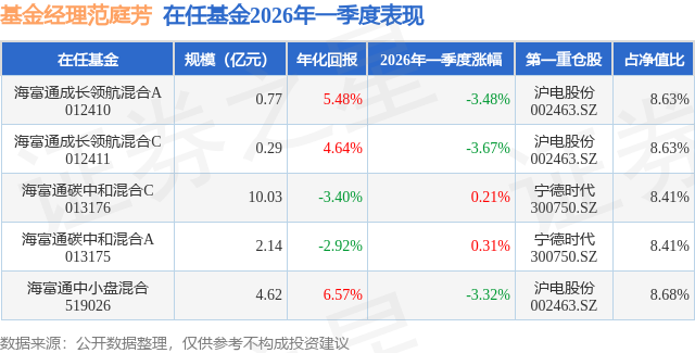 证券之星消息,日前海富通中小盘混合基金公布一季报,2026年一季度最新规模4.62亿元,季度净值涨幅为-3.32%。