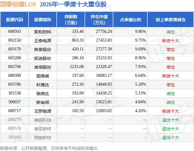 从基金规模来看,国泰估值LOF基金2026年一季度公布的基金规模为17.63亿元,较上一期规模7.16亿元变化了10.47亿元,环比变化了146.25%。该基金最新一期资产配置为:股票占净值比92.19%,债券占净值比5.37%,现金占净值比0.74%。从基金持仓来看,该基金当季前十大股票仓位达72.34%,第一大重仓股为聚和材料(688503),持仓占比为9.86%。