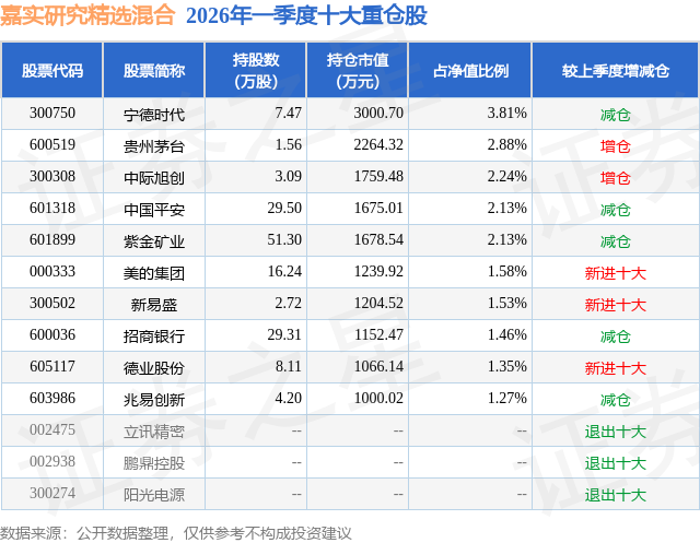从基金规模来看,嘉实研究精选混合基金2026年一季度公布的基金规模为7.87亿元,较上一期规模8.47亿元变化了-6012.48万元,环比变化了-7.1%。该基金最新一期资产配置为:股票占净值比89.11%,无债券类资产,现金占净值比11.14%。从基金持仓来看,该基金当季前十大股票仓位达20.38%,第一大重仓股为宁德时代(300750),持仓占比为3.81%。