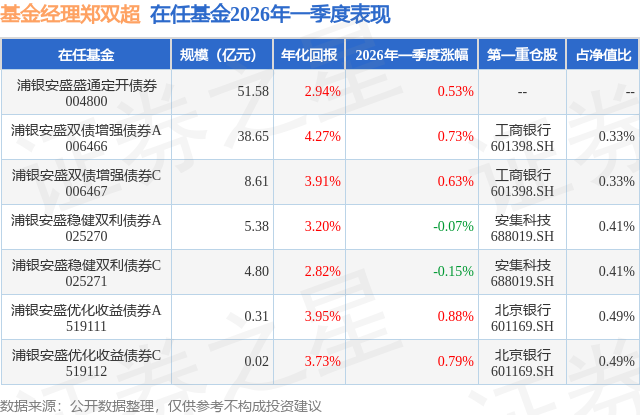 从基金规模来看,浦银安盛优化收益债券A基金2026年一季度公布的基金规模为0.31亿元,较上一期规模3459.3万元变化了-408.17万元,环比变化了-11.8%。该基金最新一期资产配置为:股票占净值比9.26%,债券占净值比81.29%,现金占净值比0.78%。从基金持仓来看,该基金当季前十大股票仓位达3.42%,第一大重仓股为兴业银行(601166),持仓占比为0.49%。