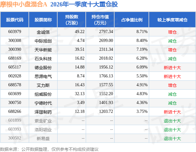 从基金规模来看,摩根中小盘混合A基金2026年一季度公布的基金规模为3.21亿元,较上一期规模3.32亿元变化了-1126.02万元,环比变化了-3.39%。该基金最新一期资产配置为:股票占净值比92.9%,无债券类资产,现金占净值比8.61%。从基金持仓来看,该基金当季前十大股票仓位达60.02%,第一大重仓股为金诚信(603979),持仓占比为8.71%。
