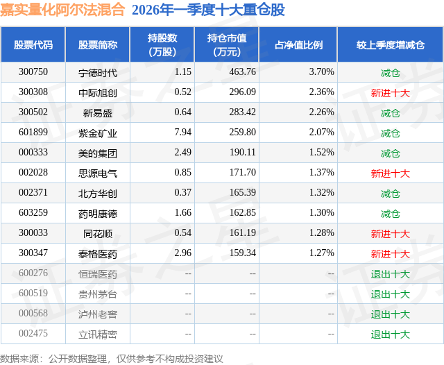 从基金规模来看,嘉实量化阿尔法混合基金2026年一季度公布的基金规模为1.25亿元,较上一期规模1.09亿元变化了1674.9万元,环比变化了15.41%。该基金最新一期资产配置为:股票占净值比94.4%,无债券类资产,现金占净值比6.42%。从基金持仓来看,该基金当季前十大股票仓位达18.45%,第一大重仓股为宁德时代(300750),持仓占比为3.7%。
