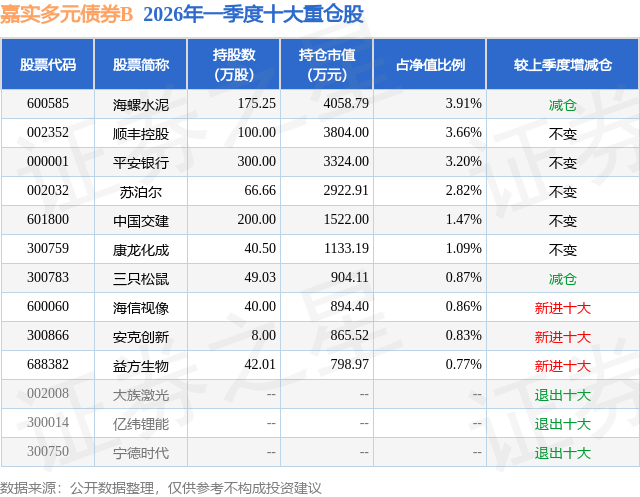 从基金规模来看,嘉实多元债券B基金2026年一季度公布的基金规模为2.78亿元,较上一期规模3.9亿元变化了-1.13亿元,环比变化了-28.86%。该基金最新一期资产配置为:股票占净值比19.73%,债券占净值比111.0%,现金占净值比0.1%。从基金持仓来看,该基金当季前十大股票仓位达19.48%,第一大重仓股为海螺水泥(600585),持仓占比为3.91%。