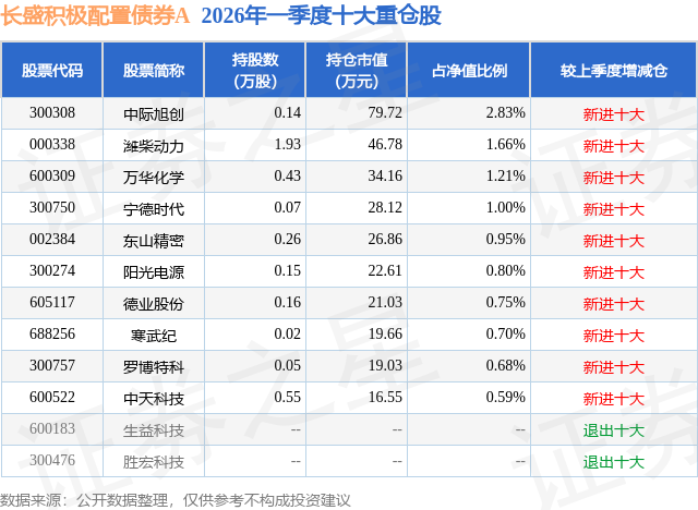 从基金规模来看,长盛积极配置债券A基金2026年一季度公布的基金规模为0.2亿元,较上一期规模2.17亿元变化了-1.97亿元,环比变化了-90.61%。该基金最新一期资产配置为:股票占净值比19.47%,债券占净值比87.23%,现金占净值比1.91%。从基金持仓来看,该基金当季前十大股票仓位达11.17%,第一大重仓股为中际旭创(300308),持仓占比为2.83%。