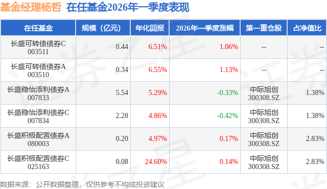 证券之星消息,日前长盛积极配置债券A基金公布一季报,2026年一季度最新规模0.2亿元,季度净值涨幅为0.17%。