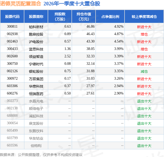 从基金规模来看,诺德灵活配置混合基金2026年一季度公布的基金规模为0.1亿元,较上一期规模888.25万元变化了64.52万元,环比变化了7.26%。该基金最新一期资产配置为:股票占净值比78.01%,债券占净值比11.9%,现金占净值比9.96%。从基金持仓来看,该基金当季前十大股票仓位达37.53%,第一大重仓股为铂科新材(300811),持仓占比为4.92%。