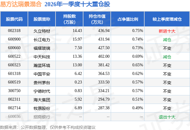 从基金规模来看,易方达瑞景混合基金2026年一季度公布的基金规模为5.83亿元,较上一期规模7.58亿元变化了-1.74亿元,环比变化了-22.99%。该基金最新一期资产配置为:股票占净值比17.39%,债券占净值比107.31%,现金占净值比0.5%。从基金持仓来看,该基金当季前十大股票仓位达6.32%,第一大重仓股为久立特材(002318),持仓占比为0.75%。