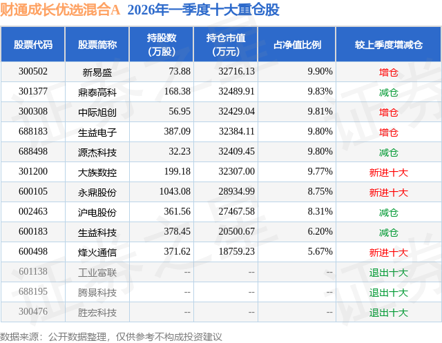 从基金规模来看,财通成长优选混合A基金2026年一季度公布的基金规模为21.89亿元,较上一期规模20.07亿元变化了1.82亿元,环比变化了9.06%。该基金最新一期资产配置为:股票占净值比93.51%,债券占净值比4.77%,现金占净值比2.71%。从基金持仓来看,该基金当季前十大股票仓位达87.84%,第一大重仓股为新易盛(300502),持仓占比为9.9%。