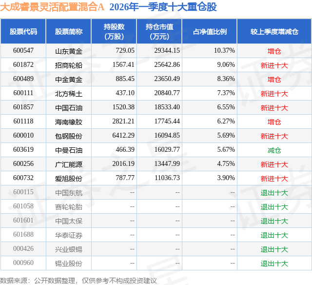 证券之星消息,日前大成睿景灵活配置混合A基金公布一季报,2026年一季度最新规模19.44亿元,季度净值涨幅为15.52%。