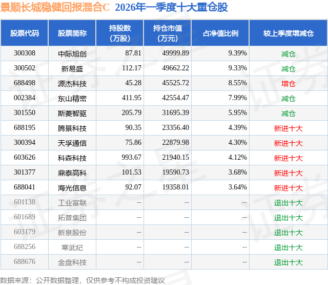 从基金规模来看,景顺长城稳健回报混合C基金2026年一季度公布的基金规模为24.22亿元,较上一期规模8757.38万元变化了23.35亿元,环比变化了2665.99%。该基金最新一期资产配置为:股票占净值比92.06%,债券占净值比5.43%,现金占净值比3.08%。从基金持仓来看,该基金当季前十大股票仓位达61.34%,第一大重仓股为中际旭创(300308),持仓占比为9.39%。