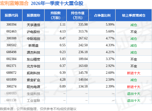 从基金规模来看,宏利蓝筹混合基金2026年一季度公布的基金规模为0.56亿元,较上一期规模5491.03万元变化了113.76万元,环比变化了2.07%。该基金最新一期资产配置为:股票占净值比93.4%,无债券类资产,现金占净值比6.79%。从基金持仓来看,该基金当季前十大股票仓位达38.68%,第一大重仓股为天孚通信(300394),持仓占比为5.99%。