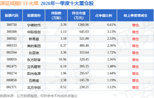 从基金规模来看,深证成指ETF大成基金2026年一季度公布的基金规模为2.06亿元,较上一期规模1.94亿元变化了1251.01万元,环比变化了6.46%。该基金最新一期资产配置为:股票占净值比99.14%,无债券类资产,现金占净值比0.85%。从基金持仓来看,该基金当季前十大股票仓位达23.14%,第一大重仓股为宁德时代(300750),持仓占比为6.61%。
