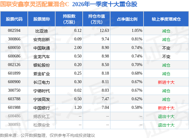 从基金规模来看,国联安鑫享灵活配置混合C基金2026年一季度公布的基金规模为0.11亿元,较上一期规模461.17万元变化了604.73万元,环比变化了131.13%。该基金最新一期资产配置为:股票占净值比20.92%,债券占净值比72.42%,现金占净值比6.38%。从基金持仓来看,该基金当季前十大股票仓位达7.26%,第一大重仓股为比亚迪(002594),持仓占比为1.05%。
