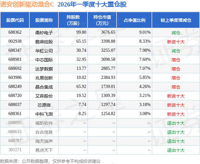 从基金规模来看,诺安创新驱动混合C基金2026年一季度公布的基金规模为2.46亿元,较上一期规模1.51亿元变化了9571.15万元,环比变化了63.54%。该基金最新一期资产配置为:股票占净值比77.38%,无债券类资产,现金占净值比21.83%。从基金持仓来看,该基金当季前十大股票仓位达59.57%,第一大重仓股为甬矽电子(688362),持仓占比为9.01%。