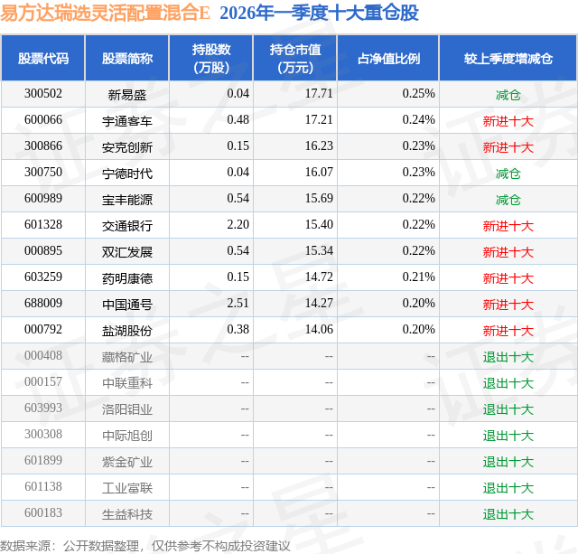 从基金规模来看,易方达瑞选灵活配置混合E基金2026年一季度公布的基金规模为0.44亿元,较上一期规模1.05亿元变化了-6084.26万元,环比变化了-58.15%。该基金最新一期资产配置为:股票占净值比19.34%,债券占净值比100.98%,现金占净值比2.85%。从基金持仓来看,该基金当季前十大股票仓位达2.22%,第一大重仓股为新易盛(300502),持仓占比为0.25%。