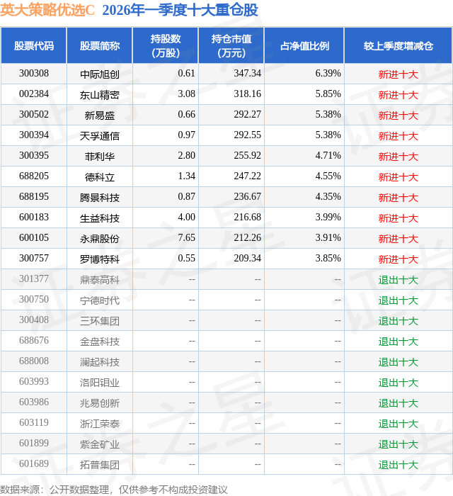 从基金规模来看,英大策略优选C基金2026年一季度公布的基金规模为0.03亿元,较上一期规模166.45万元变化了113.54万元,环比变化了68.22%。该基金最新一期资产配置为:股票占净值比86.09%,无债券类资产,现金占净值比11.32%。从基金持仓来看,该基金当季前十大股票仓位达48.36%,第一大重仓股为中际旭创(300308),持仓占比为6.39%。
