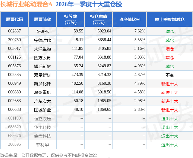 从基金规模来看,长城行业轮动混合A基金2026年一季度公布的基金规模为6.06亿元,较上一期规模8.02亿元变化了-1.97亿元,环比变化了-24.5%。该基金最新一期资产配置为:股票占净值比81.27%,无债券类资产,现金占净值比18.26%。从基金持仓来看,该基金当季前十大股票仓位达48.34%,第一大重仓股为英维克(002837),持仓占比为7.62%。