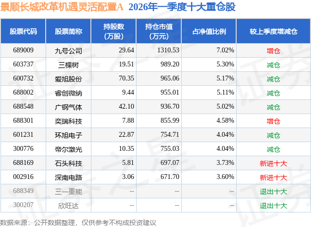 从基金规模来看,景顺长城改革机遇灵活配置A基金2026年一季度公布的基金规模为1.5亿元,较上一期规模1.24亿元变化了2605.05万元,环比变化了20.99%。该基金最新一期资产配置为:股票占净值比86.22%,无债券类资产,现金占净值比13.79%。从基金持仓来看,该基金当季前十大股票仓位达47.61%,第一大重仓股为九号公司(689009),持仓占比为7.02%。