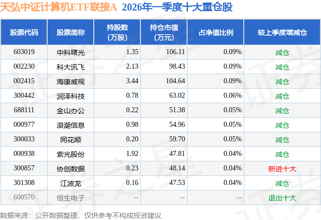 证券之星消息,日前天弘中证计算机ETF联接A基金公布一季报,2026年一季度最新规模2.85亿元,季度净值涨幅为-4.54%。