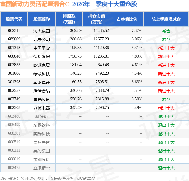 从基金规模来看,富国新动力灵活配置混合C基金2026年一季度公布的基金规模为3.28亿元,较上一期规模6.77亿元变化了-3.49亿元,环比变化了-51.52%。该基金最新一期资产配置为:股票占净值比73.86%,无债券类资产,现金占净值比25.1%。从基金持仓来看,该基金当季前十大股票仓位达46.91%,第一大重仓股为海大集团(002311),持仓占比为7.37%。