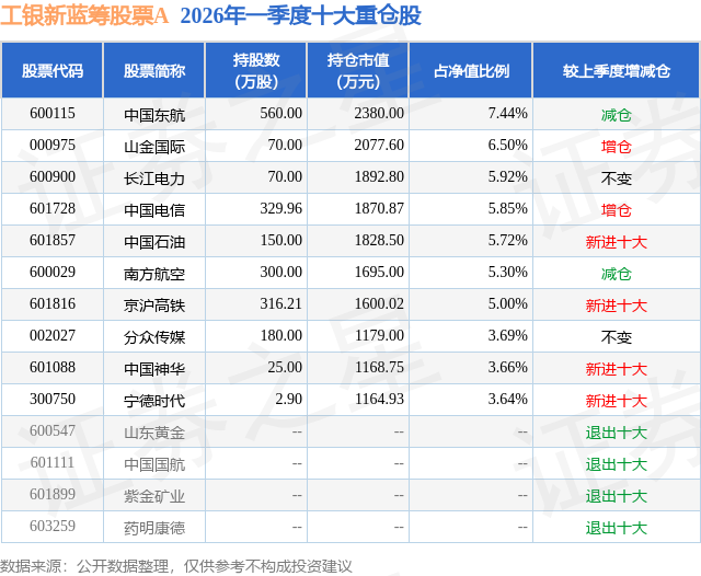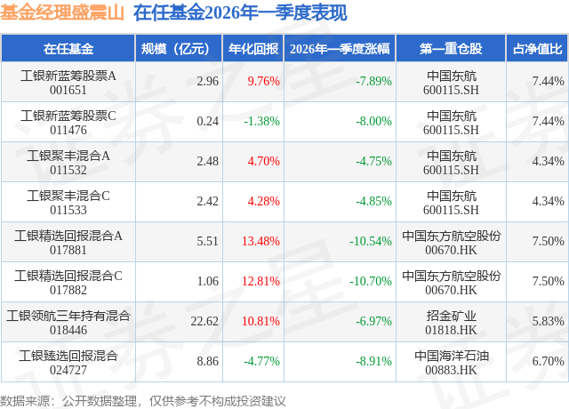 从基金规模来看,工银新蓝筹股票A基金2026年一季度公布的基金规模为2.96亿元,较上一期规模3.73亿元变化了-7695.98万元,环比变化了-20.64%。该基金最新一期资产配置为:股票占净值比85.7%,无债券类资产,现金占净值比13.45%。从基金持仓来看,该基金当季前十大股票仓位达52.72%,第一大重仓股为中国东航(600115),持仓占比为7.44%。