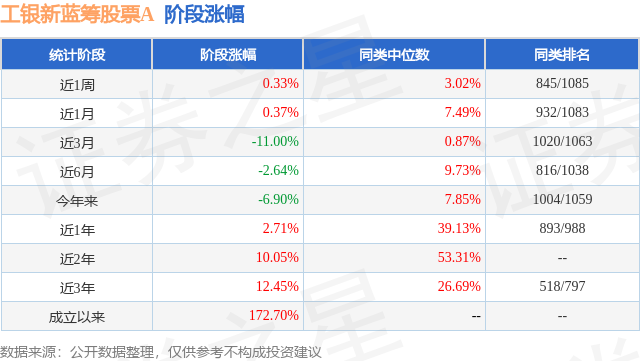 从业绩表现来看,工银新蓝筹股票A基金过去一年净值涨幅为2.71%,在同类基金中排名893/988,同类基金过去一年净值涨幅中位数为39.13%。而基金过去一年的最大回撤为-15.83%,成立以来的最大回撤为-28.29%。