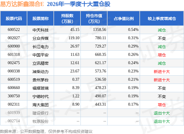 从基金规模来看,易方达新鑫混合E基金2026年一季度公布的基金规模为23.0亿元,较上一期规模17.03亿元变化了5.97亿元,环比变化了35.02%。该基金最新一期资产配置为:股票占净值比8.44%,债券占净值比107.28%,现金占净值比0.53%。从基金持仓来看,该基金当季前十大股票仓位达2.63%,第一大重仓股为中天科技(600522),持仓占比为0.54%。