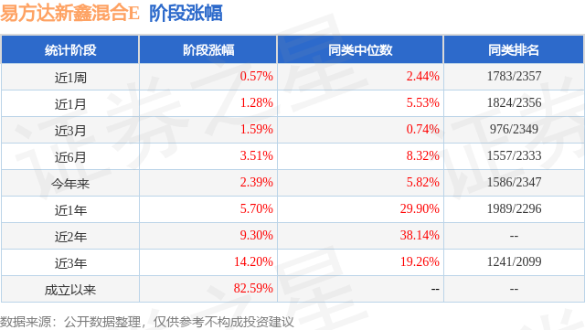 从业绩表现来看,易方达新鑫混合E基金过去一年净值涨幅为5.7%,在同类基金中排名1989/2296,同类基金过去一年净值涨幅中位数为29.9%。而基金过去一年的最大回撤为-0.94%,成立以来的最大回撤为-5.95%。