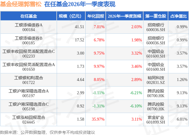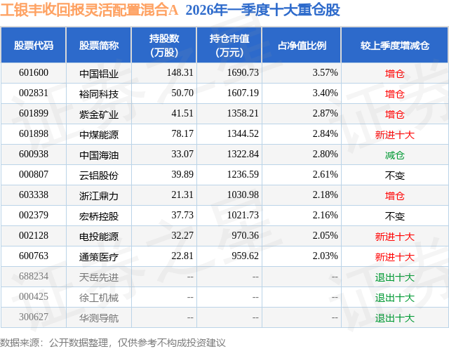 从基金规模来看,工银丰收回报灵活配置混合A基金2026年一季度公布的基金规模为1.73亿元,较上一期规模9120.16万元变化了8217.17万元,环比变化了90.1%。该基金最新一期资产配置为:股票占净值比73.61%,债券占净值比16.3%,现金占净值比1.3%。从基金持仓来看,该基金当季前十大股票仓位达26.51%,第一大重仓股为中国铝业(601600),持仓占比为3.57%。