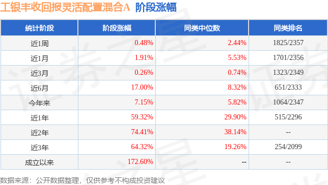 从业绩表现来看,工银丰收回报灵活配置混合A基金过去一年净值涨幅为59.32%,在同类基金中排名515/2296,同类基金过去一年净值涨幅中位数为29.9%。而基金过去一年的最大回撤为-9.26%,成立以来的最大回撤为-25.12%。