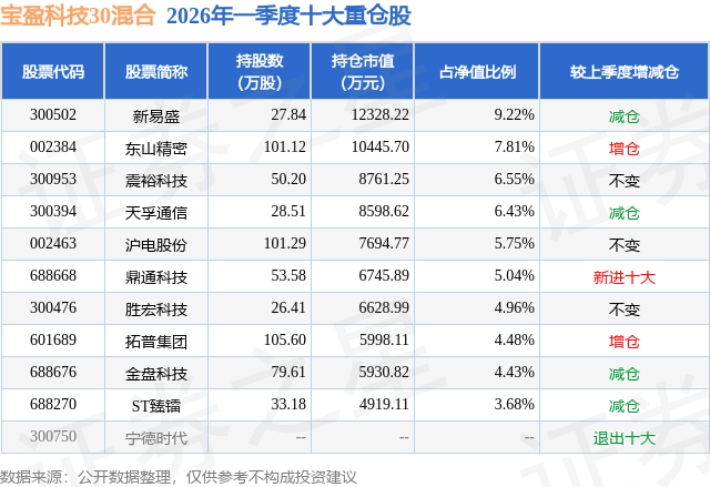 从基金规模来看,宝盈科技30混合基金2026年一季度公布的基金规模为13.38亿元,较上一期规模9.06亿元变化了4.32亿元,环比变化了47.69%。该基金最新一期资产配置为:股票占净值比92.17%,无债券类资产,现金占净值比8.02%。从基金持仓来看,该基金当季前十大股票仓位达58.35%,第一大重仓股为新易盛(300502),持仓占比为9.22%。