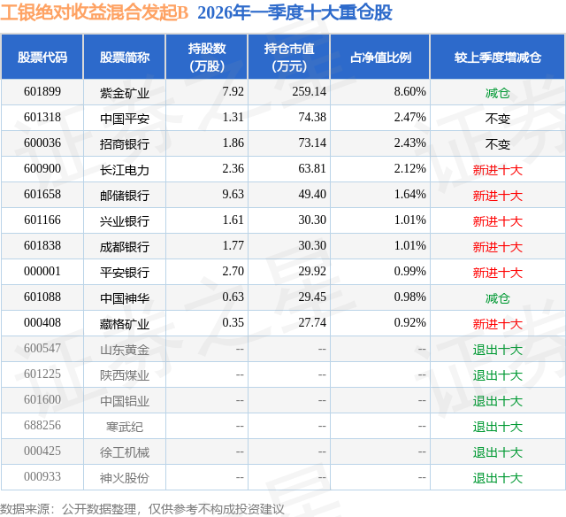 从基金规模来看,工银绝对收益混合发起B基金2026年一季度公布的基金规模为0.1亿元,较上一期规模1448.98万元变化了-423.49万元,环比变化了-29.23%。该基金最新一期资产配置为:股票占净值比28.43%,债券占净值比6.72%,现金占净值比41.29%。从基金持仓来看,该基金当季前十大股票仓位达22.17%,第一大重仓股为紫金矿业(601899),持仓占比为8.6%。