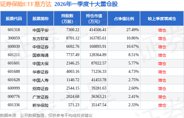 从基金规模来看,证券保险ETF易方达基金2026年一季度公布的基金规模为150.8亿元,较上一期规模176.13亿元变化了-25.34亿元,环比变化了-14.38%。该基金最新一期资产配置为:股票占净值比99.84%,无债券类资产,现金占净值比0.21%。从基金持仓来看,该基金当季前十大股票仓位达78.12%,第一大重仓股为中国平安(601318),持仓占比为27.49%。