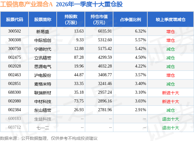 从基金规模来看,工银信息产业混合A基金2026年一季度公布的基金规模为9.48亿元,较上一期规模9.11亿元变化了3735.07万元,环比变化了4.1%。该基金最新一期资产配置为:股票占净值比85.96%,债券占净值比7.39%,现金占净值比6.87%。从基金持仓来看,该基金当季前十大股票仓位达42.04%,第一大重仓股为新易盛(300502),持仓占比为6.32%。