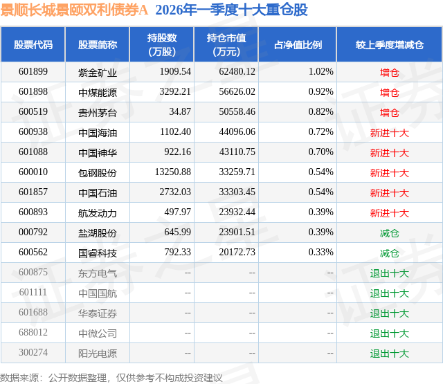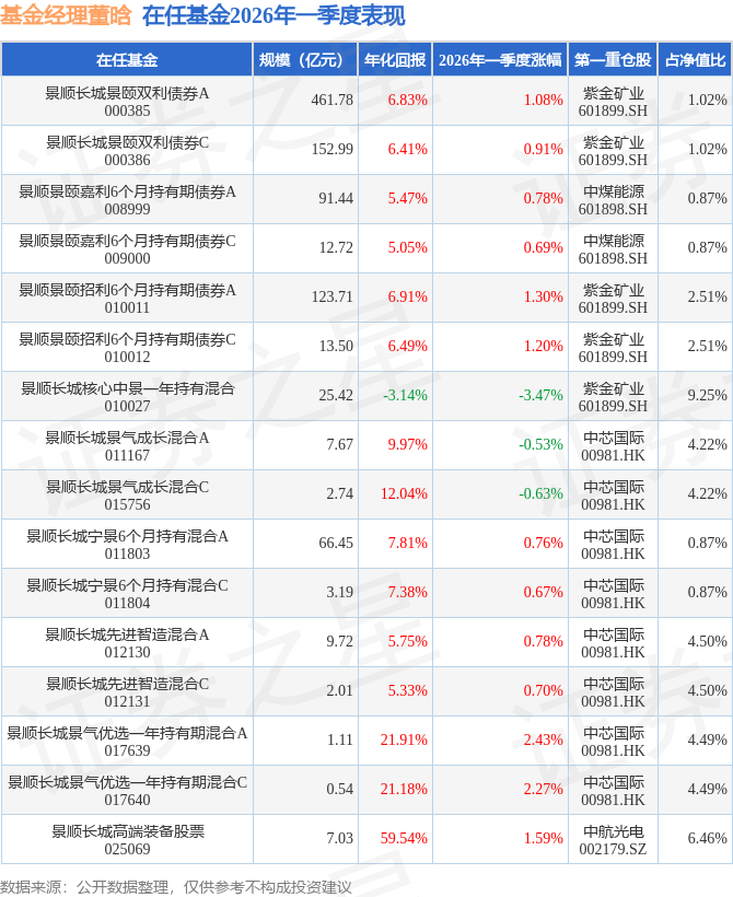 从基金规模来看,景顺长城景颐双利债券A基金2026年一季度公布的基金规模为461.78亿元,较上一期规模140.28亿元变化了321.5亿元,环比变化了229.19%。该基金最新一期资产配置为:股票占净值比13.36%,债券占净值比90.8%,现金占净值比0.21%。从基金持仓来看,该基金当季前十大股票仓位达6.37%,第一大重仓股为紫金矿业(601899),持仓占比为1.02%。