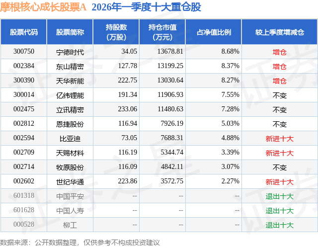 从基金规模来看,摩根核心成长股票A基金2026年一季度公布的基金规模为13.98亿元,较上一期规模7.37亿元变化了6.61亿元,环比变化了89.72%。该基金最新一期资产配置为:股票占净值比89.96%,无债券类资产,现金占净值比10.2%。从基金持仓来看,该基金当季前十大股票仓位达58.79%,第一大重仓股为宁德时代(300750),持仓占比为8.68%。