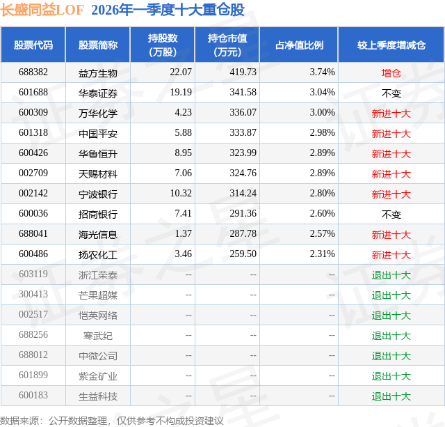 从基金规模来看,长盛同益LOF基金2026年一季度公布的基金规模为1.12亿元,较上一期规模1.08亿元变化了424.07万元,环比变化了3.93%。该基金最新一期资产配置为:股票占净值比87.46%,无债券类资产,现金占净值比14.66%。从基金持仓来看,该基金当季前十大股票仓位达28.82%,第一大重仓股为益方生物(688382),持仓占比为3.74%。