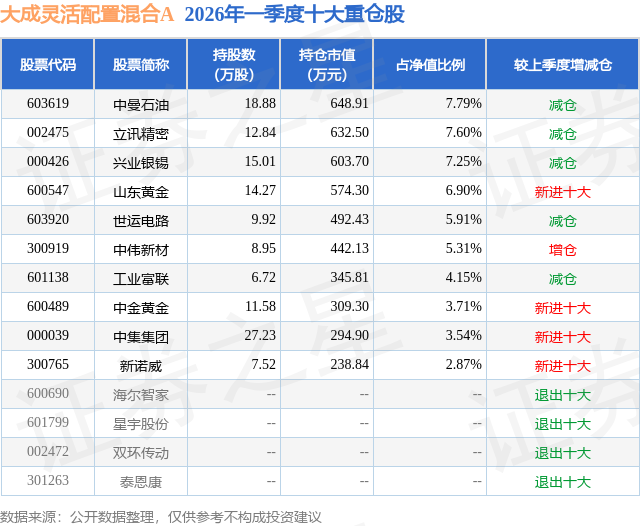 从基金规模来看,大成灵活配置混合A基金2026年一季度公布的基金规模为0.83亿元,较上一期规模8324.85万元变化了-17.9万元,环比变化了-0.22%。该基金最新一期资产配置为:股票占净值比81.48%,无债券类资产,现金占净值比18.35%。从基金持仓来看,该基金当季前十大股票仓位达55.03%,第一大重仓股为中曼石油(603619),持仓占比为7.79%。